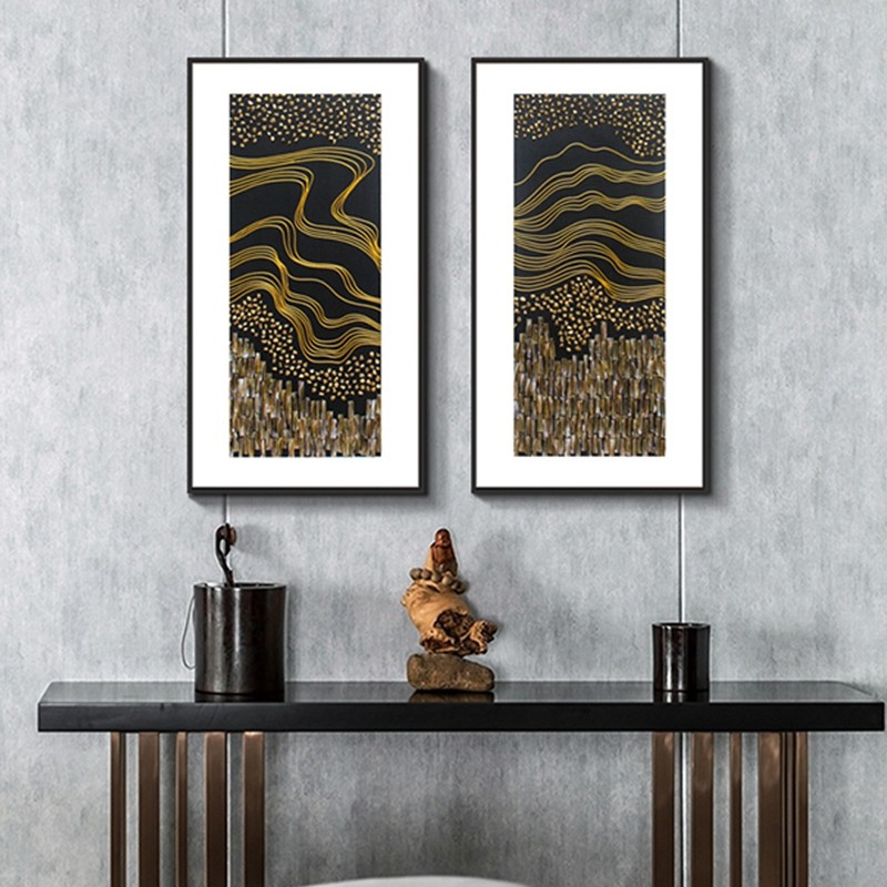 新中式客廳裝飾畫餐廳原創純手繪線條貝殼畫玄關鋁合金框實物畫